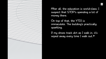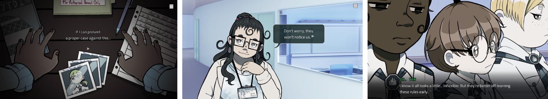 The writing hooked me from the get-go and did a good job at introducing me to this world and to the role STOP plays in it (I certainly want to check out malViolence now that I played this one!). And the way it escalated!! Starting out so smoothly with only its faint hints that something is off, and then never stopping to ramp up the intensity until its cathartic climax. I couldn't stop thinking that Dr. Deidre and Pavel's story would make my mom bawl her eyes out, it has such a poignant core about how children deserve care and dignity and the freedom to make their own choices - To not have their personality and desires stripped from them. I couldn't help but wonder if Deidre intuitively chose Pavel as a case study subject because his creative and headstrong tendencies reminded her of herself when she was a child.