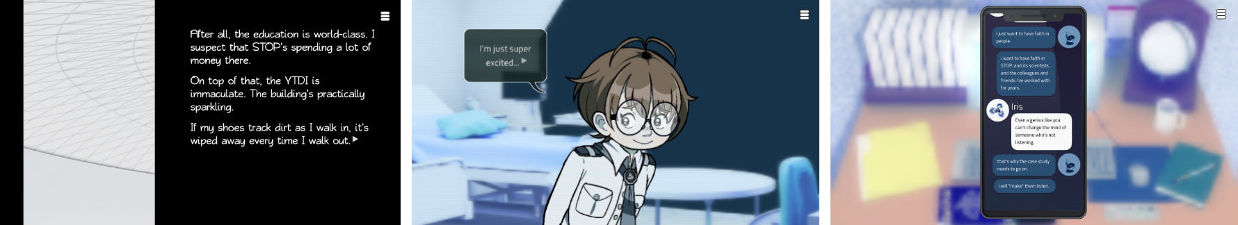 Well, this was one hell of a way to get me interested in MalViolence! The core story is so interesting, and the different ways it was conveyed helped keep me engaged the whole time; switching from research log, to journal, text message and video interview was a really good idea to keep things fresh. It also made it hard to put down! Even when I needed to do something else, I kept thinking, "I'll just see this next one!" ...and before I knew it, I just played through the whole thing! Dr. Deirdre was such a great protagonist, and it was great seeing her grow from someone more or less complacent, believing it was possible to reform STOP from within, to someone willing to take actual action against them. The climax of the story was so tense! Presentation wise, this is top notch stuff! The production values feel so high, I'm amazed that you were all able to complete this in a month! Fantastic UI as well. Great work to the whole team, and I'm looking forward to trying out MalViolence next!